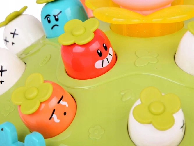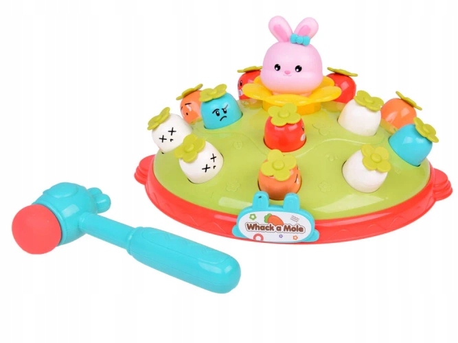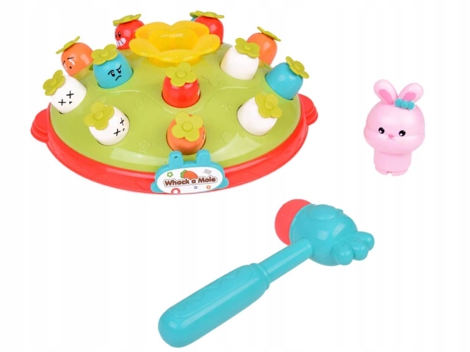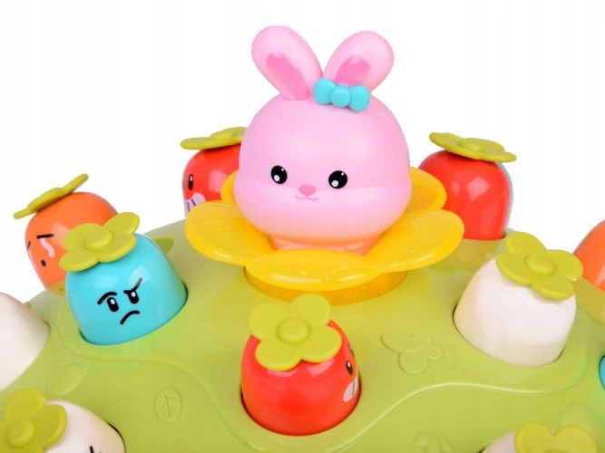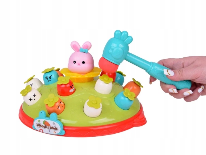 - Na samej górze czeka różowy króliczek, który skacze w powietrze, gdy dziecko uderzy młoteczkiem w odpowiednie warzywo.
