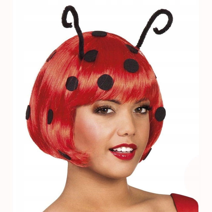 ✅ Peruka biedronki, fryzura typu „Klasyczny Bob” czerwona z czarnymi kropkami, i czułkami które imitują wygląd biedronki. Peruka posiada czarne czułki, które posiadają druciki co umożliwia ich regulowanie.