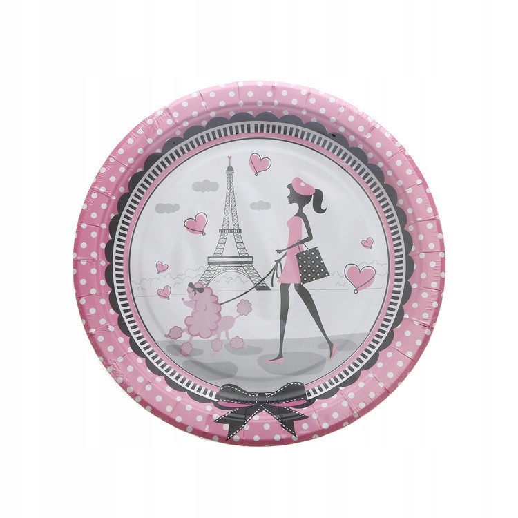 Talerzyki papierowe Paryż różowe 7cali – 18 cm, 6szt