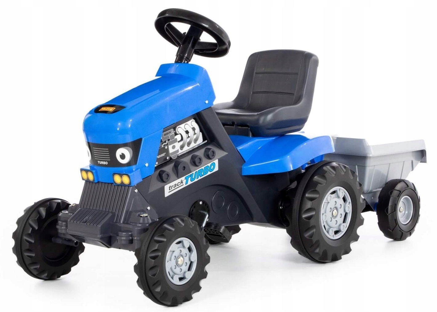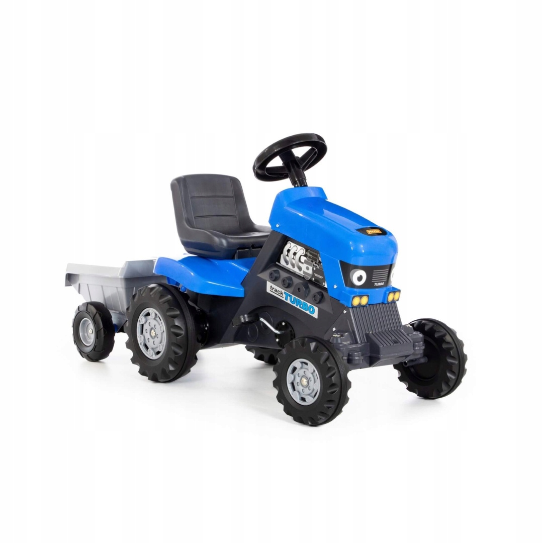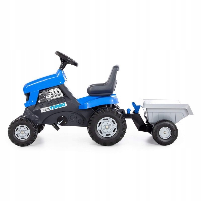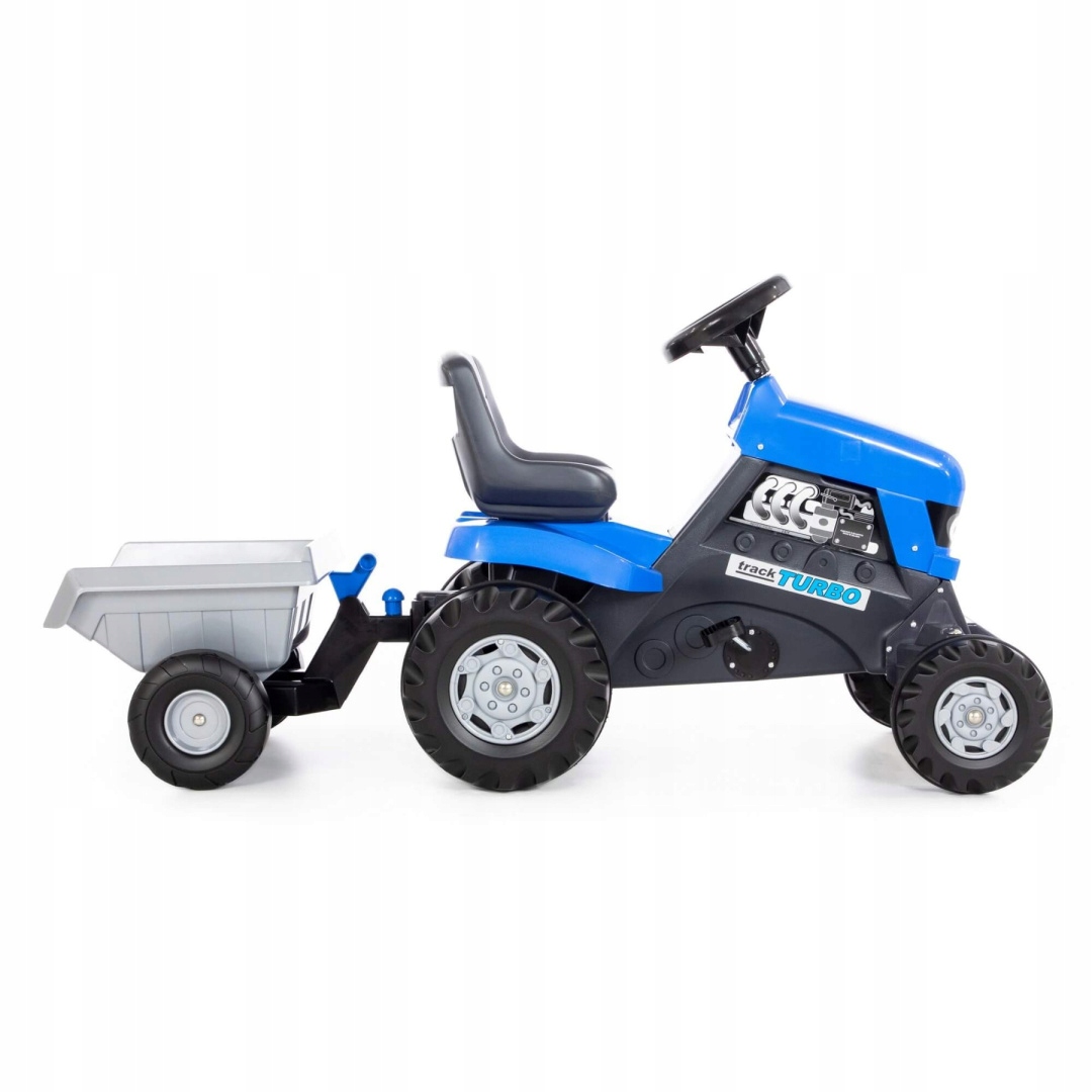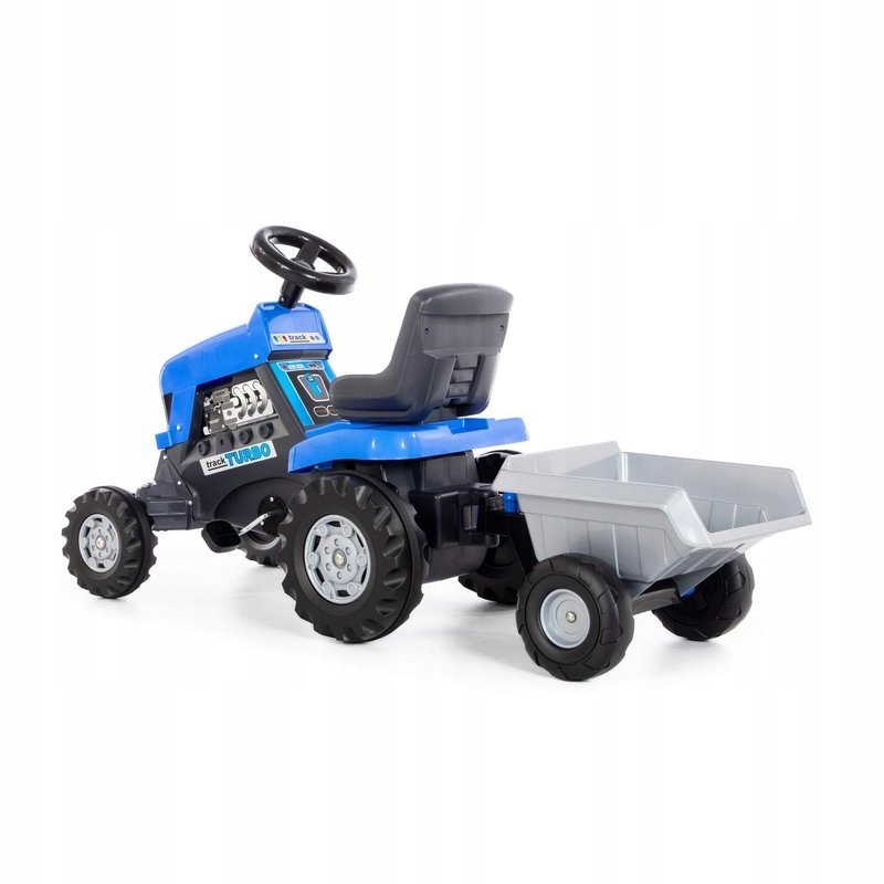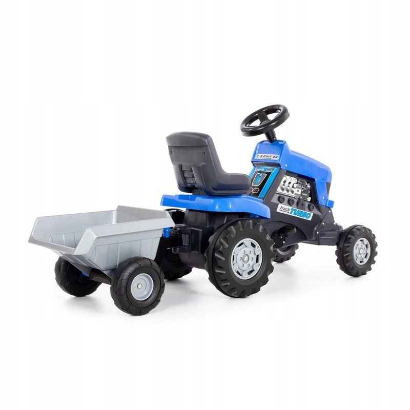 Traktor – jeździk na pedały Turbo w kolorze niebieskim od firmy Polesie. Mini traktorek świetnie nadaje się do zabawy w domu i na dworze. Traktor – jeździk wyposażony jest w wygodne siedzenie. Do ciągnika dołączona jest zdejmowana naczepa, którą dziecko będzie mogło samodzielnie przyczepić lub odłączyć. Naczepa jest w kolorze szarym. Mocowana jest za pomocą haka. Mechanizmem napędzającym pojazd jest łańcuch. Koła w traktorku są plastkowe i skrętne. Z przodu koła są mniejsze. Z tyłu z kolei większe i szersze. Na kołach jeździka są gumowe nakładki dla lepszej amortyzacji. Struktura bieżnika opon umożliwia podróżowanie pojazdem nawet na nierównej nawierzchni. Solidnie wykonany, z najlepszej jakości materiałów (zarówno plastikowych jak i metalowych).