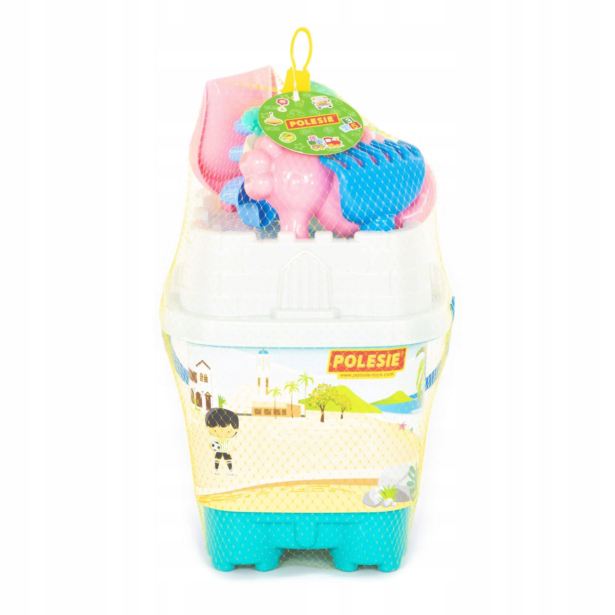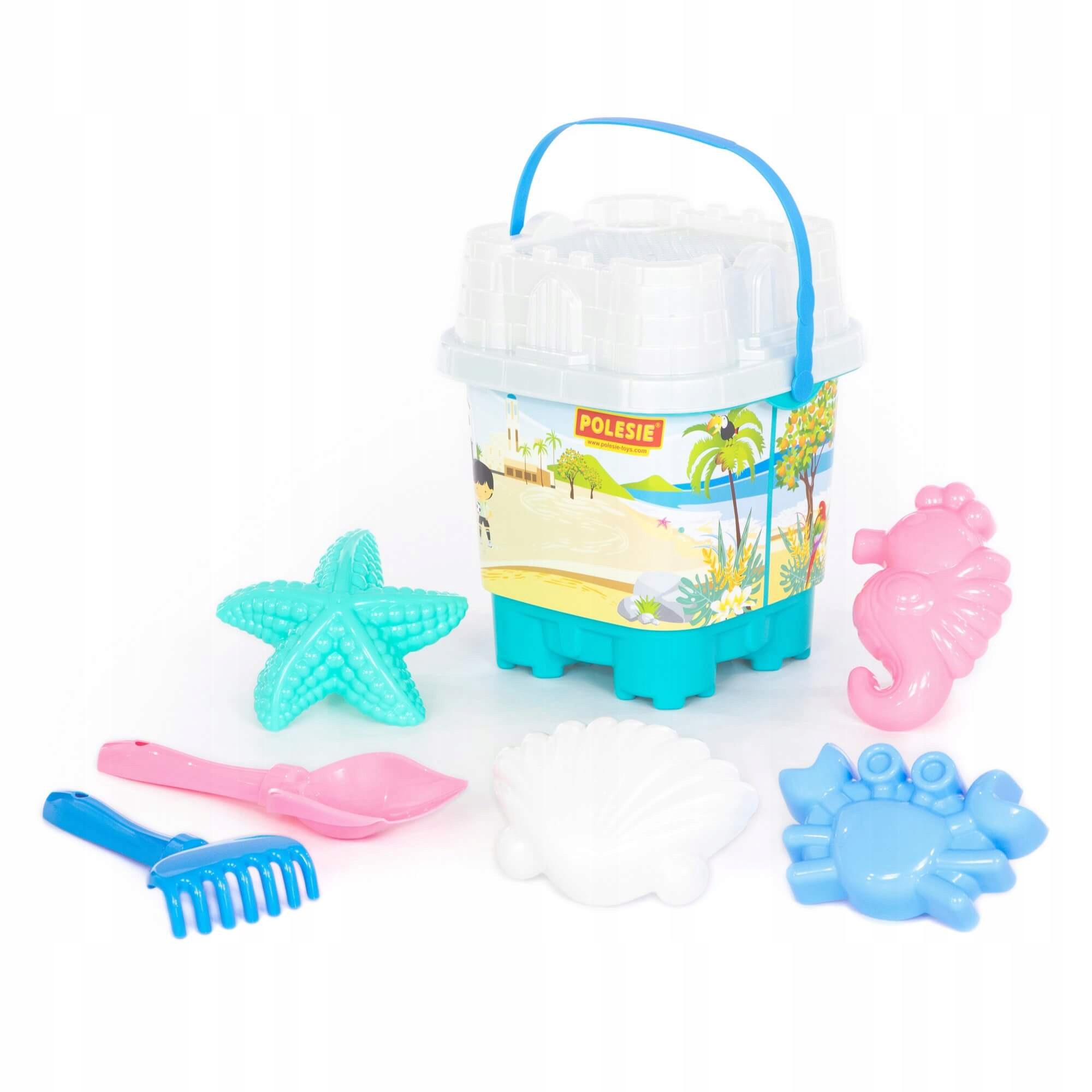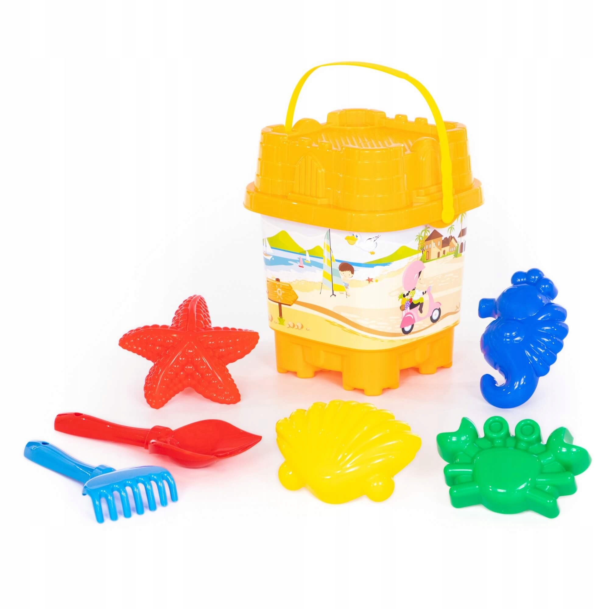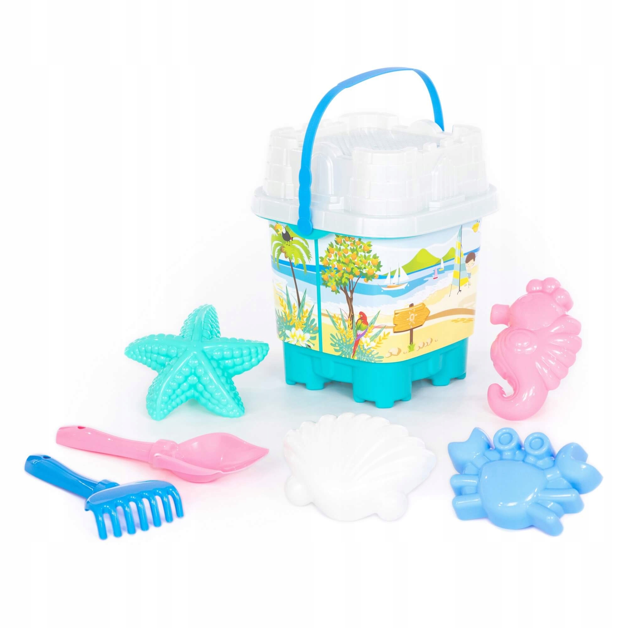 Zestaw Nr592: wiaderko-zamek duże z nalepką, sito-zamek duże, łopatka Nr5, grabki Nr5, foremki (krab Nr1 + muszla Nr1 + konik morski + rozgwiazda Nr1)
